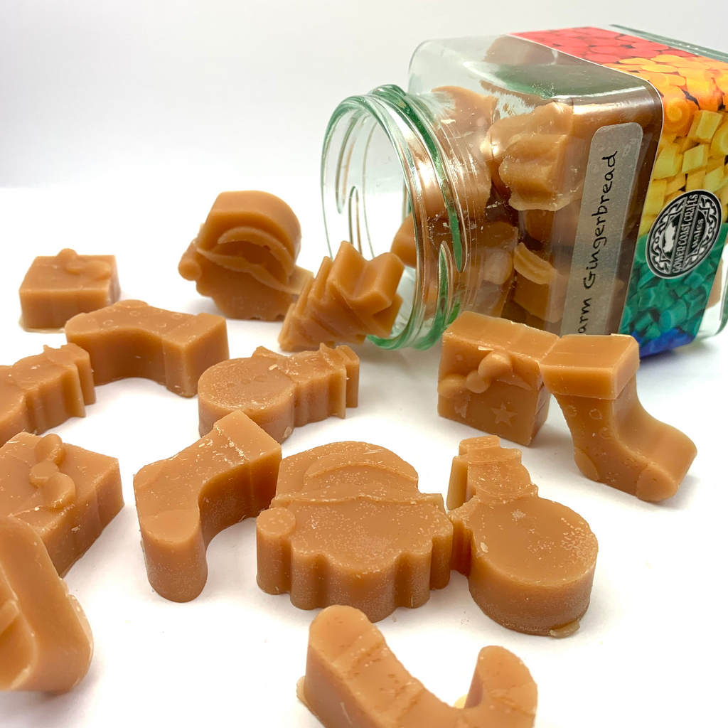 Jar of Warm Gingerbread scented Wax Melts in a variety of Christmas Shapes