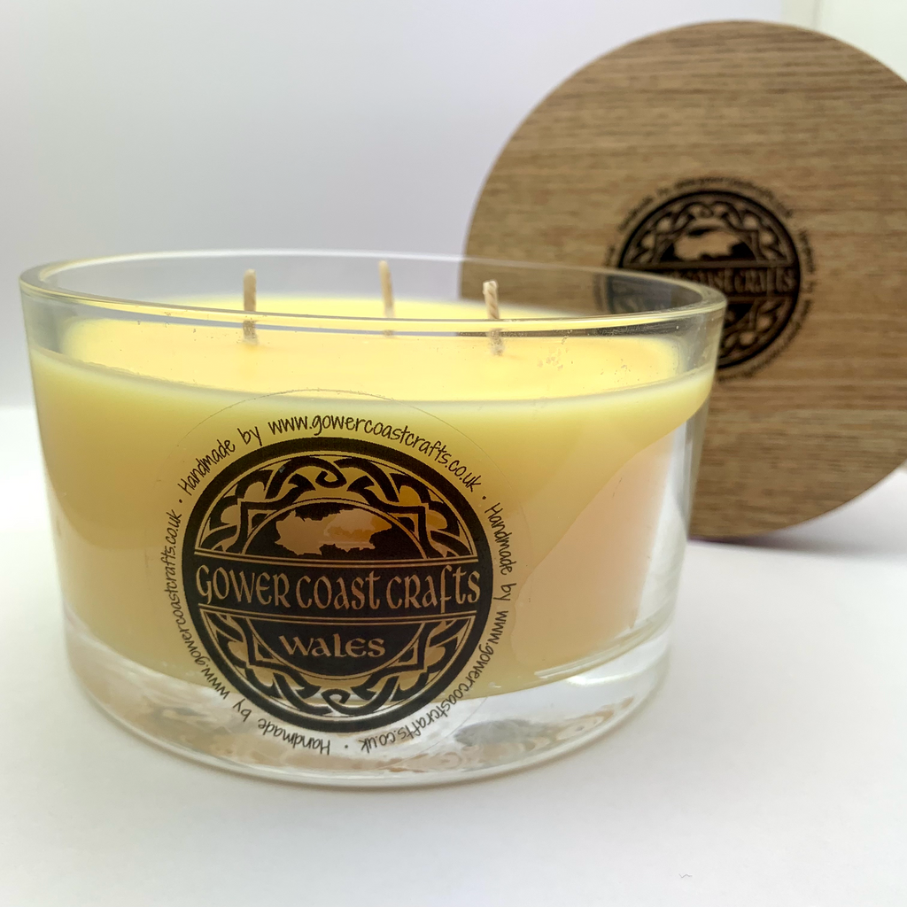 Triple Wick candle jar measures 12.5cm diameter, 7.5cm high