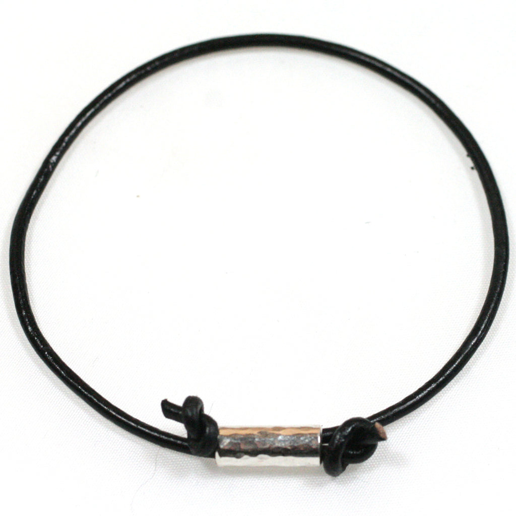 Solid Silver Hammered Tube and Leather Cord Wristband / Bracelet