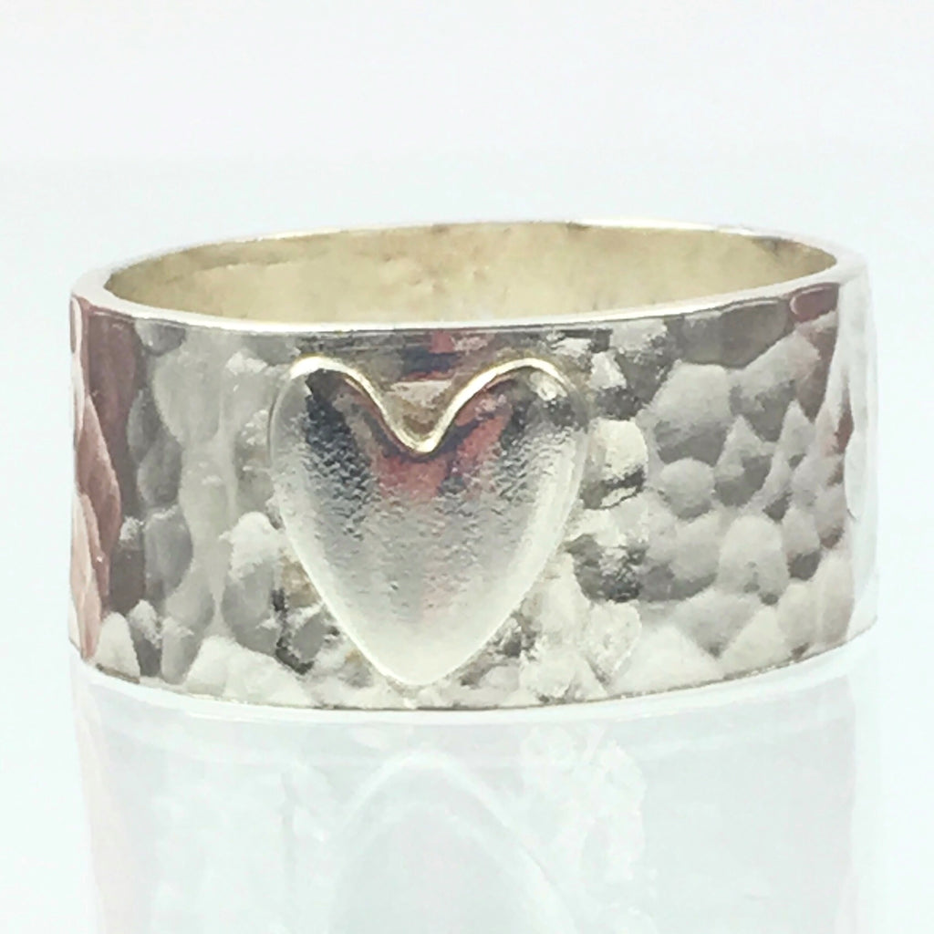 Solid Silver 10mm Hammered Band Ring with a Solid Silver Hand-cut Heart