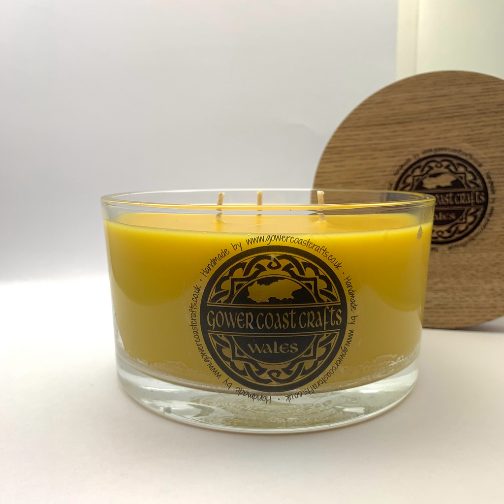 Triple Wick candle jar measures 12.5cm diameter, 7.5cm high