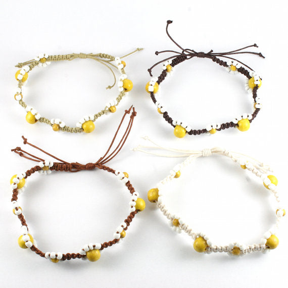Each anklet has 4 large and 5 small daisies made from wooden and seed beads.